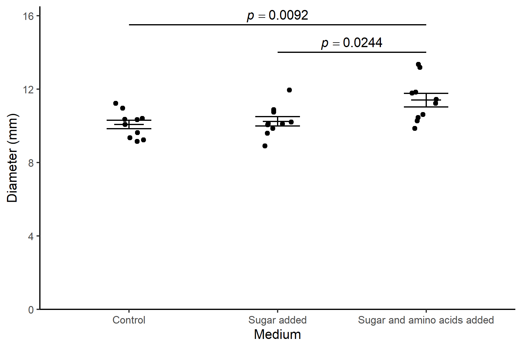 There was a significant effect of media on the diameter of bacterial colonies (F = 6.11; d.f. = 2, 27; p = 0.0065). Post-hoc testing with Tukey’s Honestly Significant Difference test (Tukey 1949) revealed the colony diameters were significantly larger when grown with both sugar and amino acids (\(\bar{x} \pm s.e\): 11.4 \(\pm\) 0.37 mm) than with neither (10.07 \(\pm\) 0.23 mm; p = 0.0092) or just sugar (10.24 \(\pm\) 0.26 mm; p = 0.0244). See Figure 16.5.