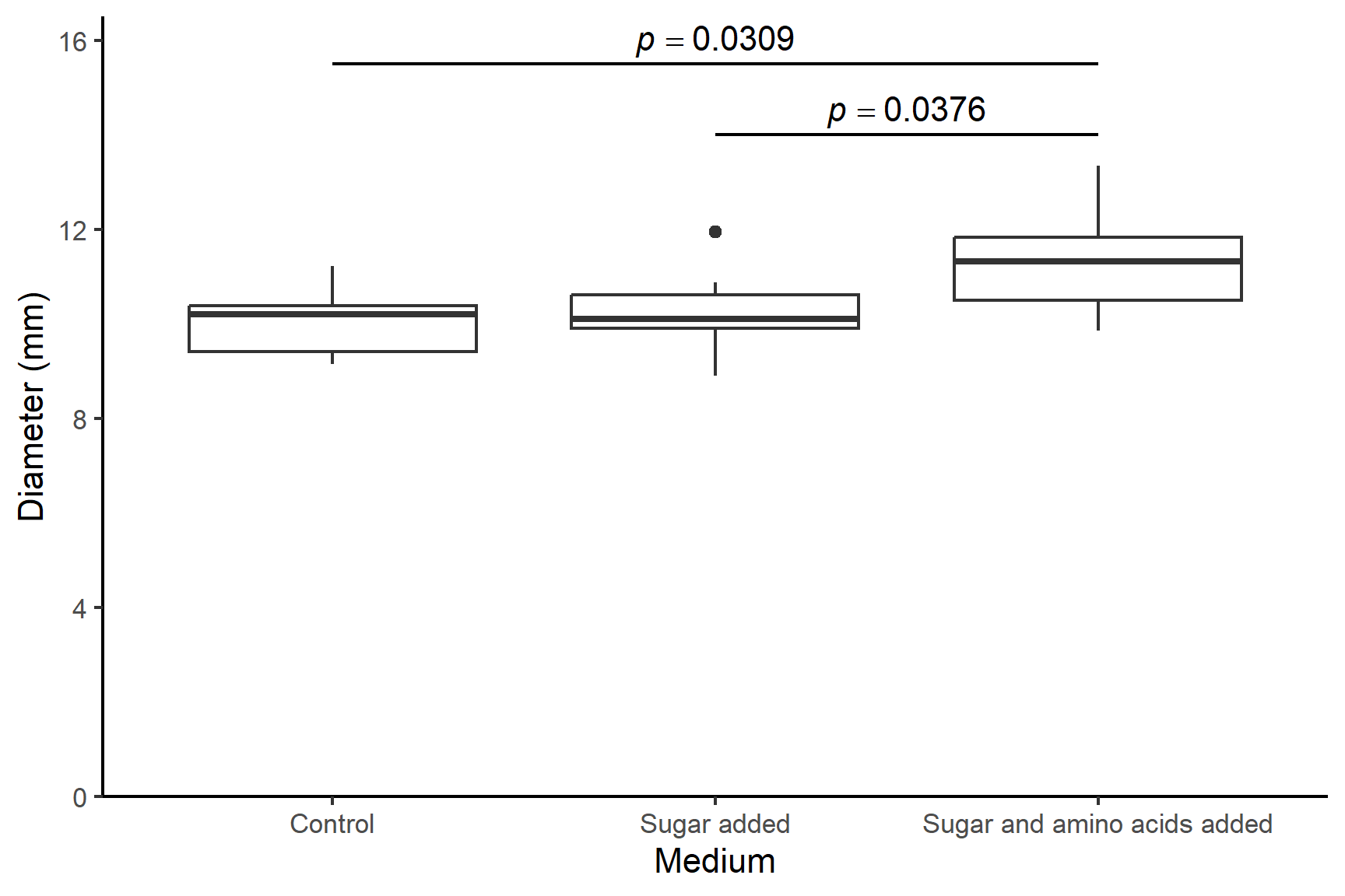 There is a significant effect of media on the diameter of bacterial colonies (Kruskal-Wallis: chi-squared = 8.1; df = 2; p-value = 0.0174) with colonies growing significantly better when both sugar and amino acids are added to the medium. Post-hoc testing with the Dunn test (Dunn 1964) revealed the colony diameters were significantly larger when grown with both sugar and amino acids (median = 11.3 mm) than with neither (median = 10.07 mm; p = 0.0309) or just sugar (median = 10.1 mm; p = 0.0376). See Figure 17.1.